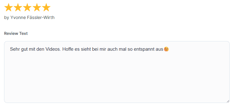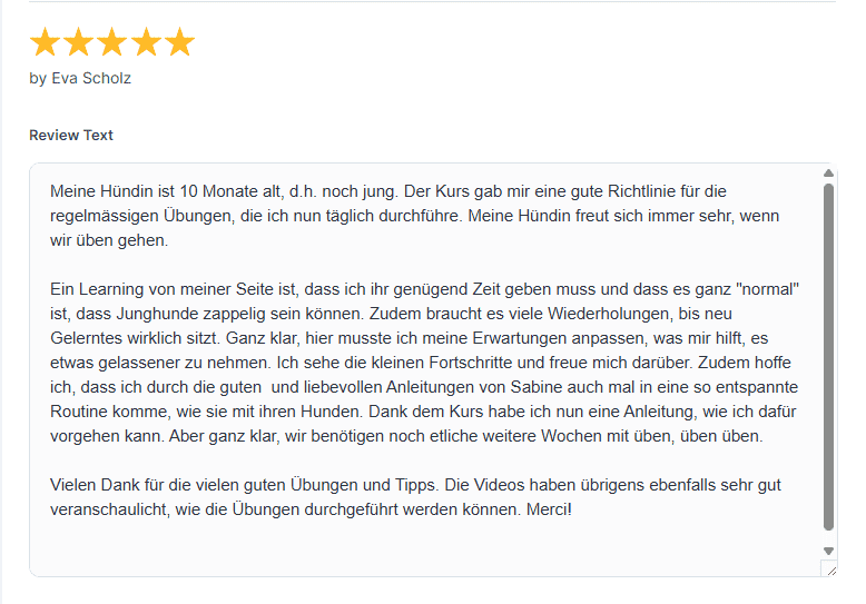 “Ich wollte mich nochmals ganz herzlich für den tollen Kurs bedanken. Meine Hündin und ich konnten während diesen 5 Wochen sehr viel neues Lernen und weiter an uns arbeiten. Dank den leicht verständlichen Videos, den Hintergrundinfos und den Beispielen mit Sabines Hunden, konnten wir die Übungen ohne Probleme selber umsetzten. Macht bitte weiter so, dass auch zukünftige Doodle Besitzer davon profitieren können.”